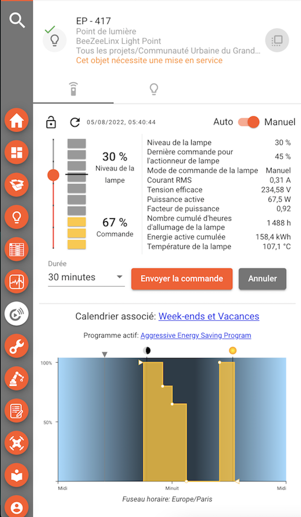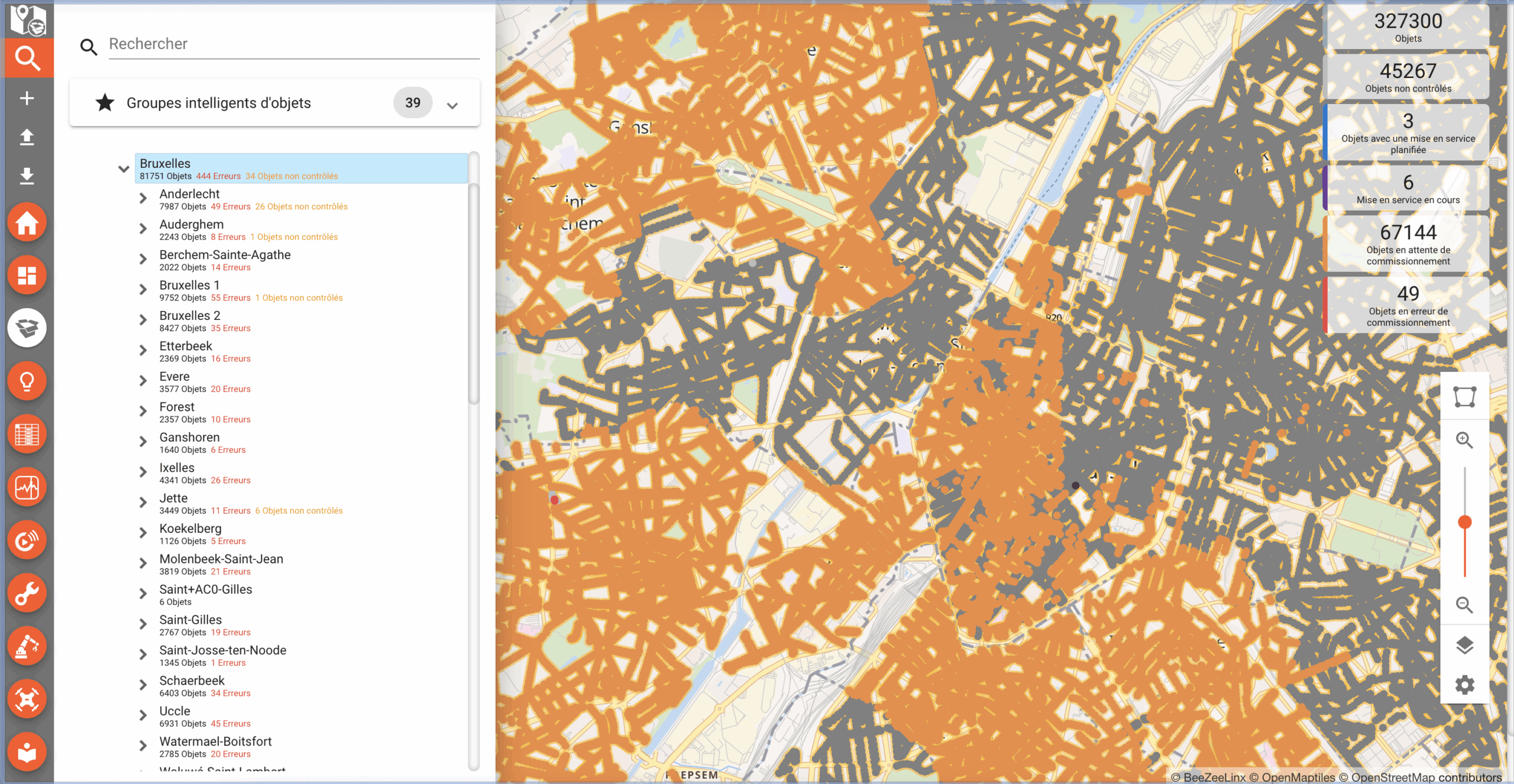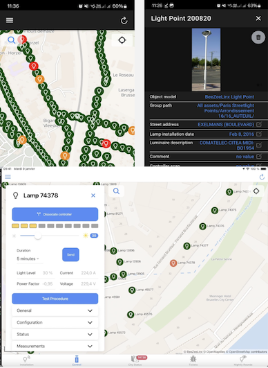 Many object & asset types available for outdoor lighting (luminaires, luminaire controllers, cabinet controllers, activity sensors, photocells), traffic counting, parking guidance (spots, zones, groups, panels), city information panels, building (buildings, floors, zones, rooms), occupancy, air quality, noise, building efficiency, solar production, weather, street maintenance, electrical cabinets, safety sensors and more.